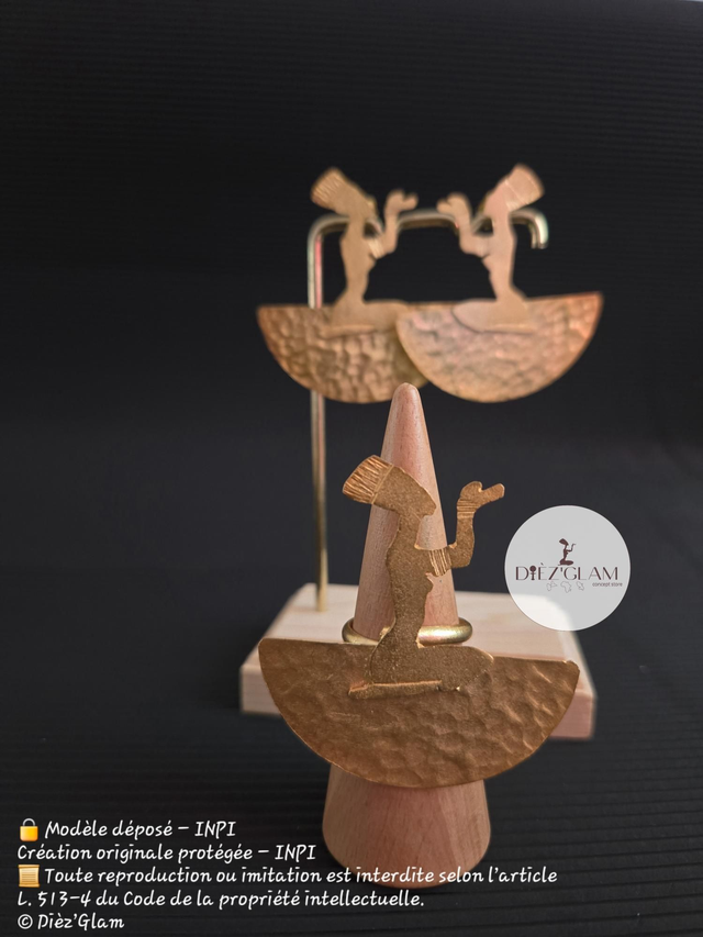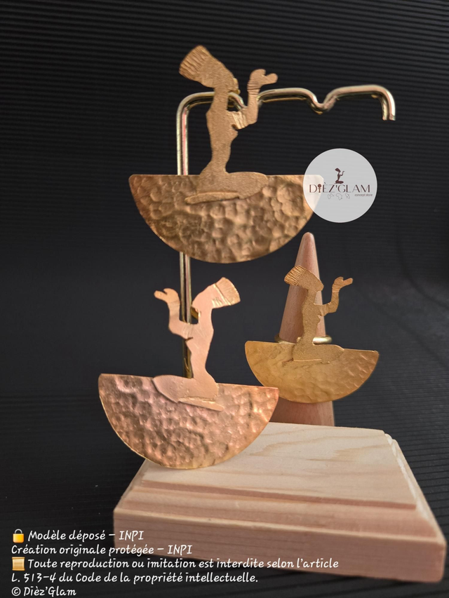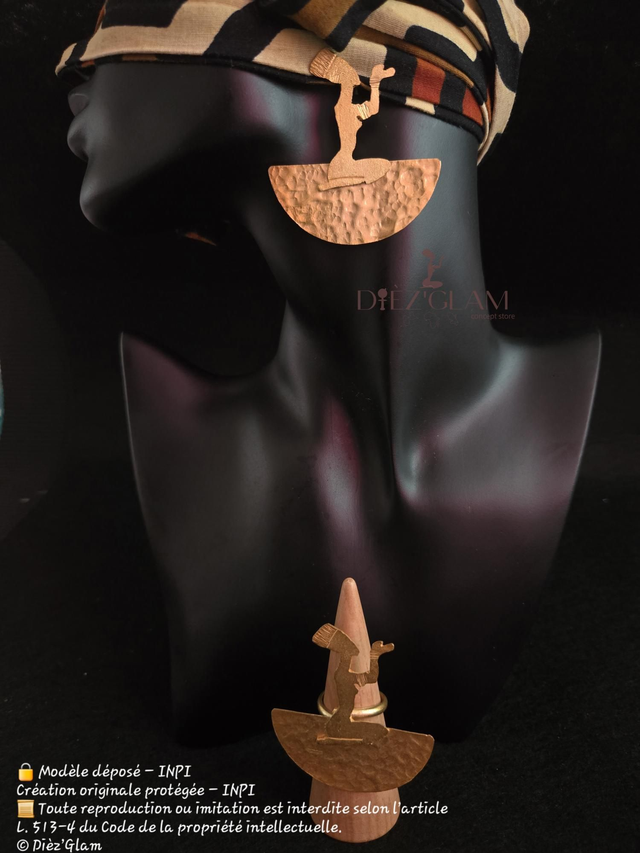 Sa coiffure, élégamment attachée souligne son allure majestueuse. Forgée en bronze par un artisan sénégalais, chaque piéce est façonnée à la main, la rendant unique. Une œuvre d’art à porter ,qui relie l’Afrique à la Caraïbe, en racontant une histoire de transmission et d’identité.